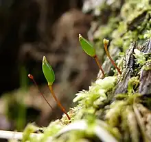The moss is an annual or biennial plant and grows in disturbed habitats or as a pioneer species.[8][17] The plants grow on decaying wood, rock outcrops, or directly on the soil.[6][7] They do not grow regularly or reliably at given locations, and frequently disappear from places where they have previously been found.[7] Sporophyte stages begin their development in the autumn, and are green through the winter months.[7] Spores are mature and ready for dispersal by the late spring or early summer.[6][8] The spores are ejected from the capsule in puffs when raindrops fall upon the capsule's flattened top.[8]