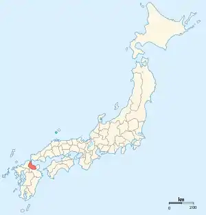 Buzen Province (豊前国, Bunzen-no kuni) was a province of Japan in the area of northeastern Kyūshū, corresponding to part of southeastern Fukuoka Prefecture and northwestern Ōita Prefecture.[1]Buzen bordered on Bungo to the south, and Chikuzen to the north and west. Its abbreviated form name was Hōshū (豊州) (a name which it shared with Bungo Province), although it was also called Nihō (二豊). In terms of the Gokishichidō system, Buzen was one of the provinces of the Saikaidō circuit. Under the Engishiki classification system, Buzen was ranked as one of the "superior countries" (上国) in terms of importance, and one of the "far countries" (遠国) in terms of distance from the capital.