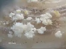 Byne's disease can appear as a powdery white coating on a shell or other calcareous specimen. It also often looks as if the specimen has been "infected" with mold; however, under magnification, the mold-like appearance is revealed to be a crystalline growth of salts.[2][3]