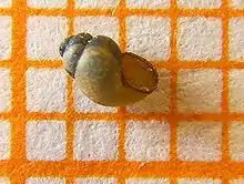 | Shell of compressa-type Bythinella reyniesii on 1 millimetre grid paper | |