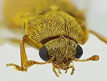 Byturus ochraceus measures 4.0–4.6 mm in length, are coloured yellow-brown with yellow hairs across the body. The pronotum is unevenly curved to the front so a front angle is apparent. The long diameter of the eyes is clearly greater than half the width of the frons. The underside is coloured dark brown to black. Some individuals change colour to grey-brown by June.[3]