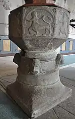 The eight sides of the basins are decorated with one or sometimes two isolated subjects, either a human, a beast or a plant, cut in low relief. The subjects appear without any particular connection to each other; in fact the lack of any overarching theme or iconographic programme has been described as a main characteristic of the style of Byzantios. A degree of such fragmentation of themes and subjects was not uncommon among Western European Romanesque artists at the time.[9] Despite this lack of a precise subject matter or narrative, it has been suggested that an overarching theme is the conflict between good and evil.[12] These fields are framed by short columns supporting rounded arches.