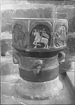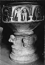 Byzantios was the first of a series of stone sculptors working on Gotland during the Romanesque period of Scandinavian art history. As the notname implies, an influence from Byzantine art characterises the style of Byzantios. It has therefore been proposed that Byzantios was from, or at the very least received training in, north-eastern Italy. Byzantios could have worked on the building site of Lund Cathedral[5][6] and possibly also at Dalby Church.[7] Eventually the artist or workshop moved to Gotland and was active there in producing baptismal fonts and architectural details on churches. It was a time when many stone churches were being built on Gotland.[7] Another suggestion is that Byzantios originally came from Germany, where art displayed a strong Byzantine influence at the time.[8] Others have argued that there is a more direct influence of Byzantine art and suggest that the workshop consisted of Russian artists. Stylistic comparisons have been made with the sculpture adorning the Cathedral of Saint Demetrius in Vladimir and the Church of the Intercession on the Nerl.[8] Svetlana Svensson has criticised this theory, arguing that the Russian churches show a clear pictorial programme, aimed at glorifying local rulers, which is completely absent in the work of Byzantios.[9] She instead suggests that the leader of the workshop came from somewhere in Western Europe, while the rest of the workshop was recruited locally on Gotland.[10]