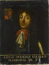 César Phoebus d'Albret, comte de Miossens[1] (1614 – 3 September 1676), was a French soldier, a Marshal of France under Louis XIV (his distant cousin), and a court gallant. He was also a cousin of the marquise de Montespan. His faithful attachment to Anne of Austria and Cardinal Mazarin during the Fronde, rather than any military talent, motivated his designation as a marshal of France (1 June 1653). He set aside the name of Miossens for the grander name of Albret.[2]