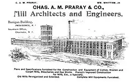 Charles Praray first emerges as the chief designer and construction engineer of the Makepeace firm, and was made a partner circa 1892.[4] As designer, in 1894, he patented what was known as "Praray's Improved Construction", a system of mill construction which separated the structure of the roof and floors of a mill from that of the walls, allowing much more daylight to enter the building. Visually, Praray's design may be most noted for its unusual window patterns, which emerge from the brick piers in a zig-zag pattern.[10] Only five of these mills have been documented as being built, but Chas. A. M. Praray & Company touted it in advertisements for many years. Prior to its demolition around 2014, the Selma Cotton Mill of 1896 in Alabama was the best-preserved example of Praray's mill design.[11] The only surviving example with walls intact is one of the Holt mills in Haw River, North Carolina.