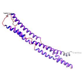 The protein product is predicted to have multiple α-helices, coiled coil, and one β-sheet. It is suggested that the protein does not contain transmembrane regions or helices, meaning that the protein is not anchored to the cell membrane nor an intracellular membrane like the Golgi apparatus.[14]