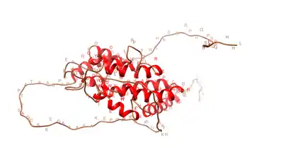 Alpha helices predicted in the C15orf39 protein are colored red, and random coils are represented as tan. No beta sheets were predicted to be part of the secondary structure for C15orf39. The amino acids not modeled were predicted to be random coils.[16]