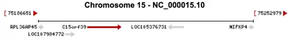 C15orf39 is located on chromosome 15 (15q24.2), spanning 16.53kb from 75487985 to 75504515 on the plus DNA strand.[1] C15orf39 has three exons, and seven introns.[1][2]
