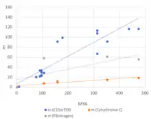 The graph displays that the C15orf39 protein is quickly evolving. C15orf39's sequence has diverged at a quicker rate than the quickly evolving fibrinogen protein in humans.[27]