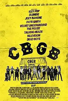 CBGB is a 2013 American biographical drama film about the former New York music venue CBGB.[2] It follows the story of Hilly Kristal's New York club from its concept as a venue for Country, Bluegrass and Blues (CBGB) to what it ultimately became: the birthplace of underground rock 'n' roll and punk.[3] The film uses devices such as a comic book-style panels, as well as onscreen text to identify important figures in the punk movement.