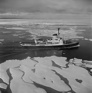 In 1953, on the icebreaker's first Arctic voyage, D'Iberville helped establish the Royal Canadian Mounted Police post at Alexandria Fjord on Ellesmere Island.[3] That year, D'Iberville and the Arctic patrol vessel C.D. Howe participated in the controversial forced resettlement of Inuit families from Port Harrison in Northern Quebec to Ellesmere Island.[6] On 29 April 1959, the Saint Lawrence Seaway was opened for the first time and D'Iberville and CGS Montcalm were the first ships to transit the lock at Saint-Lambert, Quebec.[7] In 1962, like all icebreaking vessels of the Department of Transport's Marine Service, she was transferred to the newly created Canadian Coast Guard.[8]