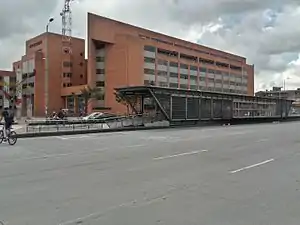 The simple-station CDS Carrera 32 is part of the TransMilenio mass-transit system of Bogotá, Colombia, which opened in the year 2000.