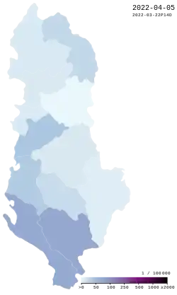 On 8 March 2020, Albania confirmed its first two cases of COVID-19, a father and son, of which, the son had traveled from Florence, Italy.[11] On 9 March, the Ministry of Health and Social Protection stated that a total of 65 people had been tested for COVID-19, 2 of whom were positive.[12] On 10 March, a total of 114 people had been tested for COVID-19, 10 of whom were positive. Of these, 6 new cases were close contacts of the first 2, while the other 2 new cases had no connection. One such case was also from the city of Durrës.[13] On 10 March, President Ilir Meta called for retired Albanian doctors to re-enter the work force.[14] On 10 March, it was discovered that a Maryland woman had contracted novel coronavirus after visiting Albania, as well as spending time in a Turkish airport.[15] On 11 March, a total of 241 people were tested, 15 of whom were positive. 12 cases were close contacts of the first case, while the other two were from Tirana and Lushnjë. The first death was also reported, an elderly woman in Durrës.[16] On 12 March, Vice Minister of Health and Social Protection Mira Rakacolli stated that during the last 24 hours 145 people had been tested for COVID-19, for a total of 298 tests performed. Of those, 23 cases tested positive for the disease, 18 of which were asymptomatic and in self-isolation and 5 were hospitalized. All cases were stated to have had history of travel to Italy or been in contact with someone who had. In total 134 people were in quarantine.[17] On 15 March, 42 cases were confirmed, 17 people were hospitalized, with 3 of them under intense hospital supervision.[18] On 16 March, 51 cases were confirmed, 23 people were hospitalized, with 3 of them under intense hospital supervision. On 17 March, 55 cases were confirmed, 25 people were hospitalized, with 3 of them under intense hospital supervision. In the last 24 hours 42 persons were tested, with four of them testing positive bringing the number from 51 to 55. On 22 March, 89 cases were confirmed, 43 people were hospitalized, with 4 of them under intensive therapy. In the last 24 hours 33 people were tested, 13 of which were positive. The first 3 recoveries were discharged from the hospital, to be put on quarantine for a further 14 days. Three new cases were reported in previously unaffected municipality of Korçë.[19] On 23 March, 104 cases were confirmed, 49 people were hospitalized, with 3 under intensive therapy. In the last 24 hours 45 people were tested, 15 of which were positive. New cases were discovered in Shkodër and Vlorë, extending the infection map to two new municipalities. Two new deaths were also reported, a 71-year-old and a 43-year-old with preexisting health conditions, bringing the total to 4.[20] On 24 March, 123 cases were confirmed, 57 people were hospitalized, with two of them under intensive therapy. In the last 24 hours 74 people were tested, 19 of whom were positive. Another death was reported, a 49 year old from Tirana, bringing the total death toll to 5, with recoveries at 10. The map of infections also extended to newly sprung cases from Lezhë, Has, and Berat.[21] On 25 March, 146 cases were confirmed, up 23 positive cases from 111 tests made in the last 24 hours. 72 people were hospitalized, 4 under intensive care of which 3 intubated and in critical condition. One new case was reported in the municipality of Krujë. No deaths were reported, while 17 recoveries had been made.[22] On 26 March, 174 cases were confirmed, up 28 positive cases from 103 tests made in the last 24 hours. 73 people were hospitalized, 3 under intensive care of which 2 intubated and in critical condition. Of all cases 4 were pediatric, asymptomatic, and in good health. The sixth death from the disease was reported, a 71-year-old woman from Tirana who also had hypertension, after 7 days of hospitalization and intensive care. The map of infections extended to include Tropoja.[23] On 27 March, 186 cases were confirmed, up 12 positive cases from 102 tests made in the last 24 hours. 77 people were hospitalized, 5 under intensive care. Two new deaths were reported in the morning, an 85-year-old woman from Tirana and a 66-year-old man from Fier, for a total of 8. Another 14 recoveries were made, for a total of 31. A new case was reported in Pukë, further expanding the map of infections.[24] On 28 March, 197 cases were confirmed, up 11 positive cases from 79 tests made in the last 24 hours. 74 people were hospitalized, 4 under intensive care. The death toll rose to 10, with recoveries at 33, of which 6 were doctors and medical staff.[25] On 29 March, 212 cases were confirmed, up 15 positive cases from 111 tests made in the last 24 hours. 76 people were hospitalized, 6 under intensive care, of which 4 intubated. Seven new recoveries were made for a total of 40. The map of infections expanded with a new case in Mirditë, with other new cases in Tiranë, Durrës, and Fier.[26] On 30 March, 223 cases were confirmed, up 11 positive cases from 90 tests made in the last 24 hours. 74 people were hospitalized, 7 under intensive care, of which 4 intubated. Four new recoveries were made, for a total of 44, while fatalities rose to 11 after a 79-year-old from Tirana died.[27] On 31 March, 243 cases were confirmed, up 20 positive cases from 145 tests made in the last 24 hours. 77 people were hospitalized, 8 under intensive care, of which 3 intubated. Eight new recoveries were made totaling 52, while fatalities rose to 13 after the deaths of an 82-year-old woman from Tirana and a 62-year-old from Durrës.[28] On 1 April, 259 cases were confirmed, up 16 positive cases from 152 tests made in the last 24 hours. 79 people were hospitalized, 7 under intensive care, of which 4 intubated. Fifteen new recoveries were made totaling 67, while the death toll rose to 15.[29] On 2 April, 277 cases were confirmed, up 18 positive cases from 96 tests made in the last 24 hours. 81 people were hospitalized, 8 under intensive care, of
