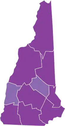 ![]() Map of the outbreak in New Hampshire by confirmed total infections per 100,000 people (last updated March 2021)