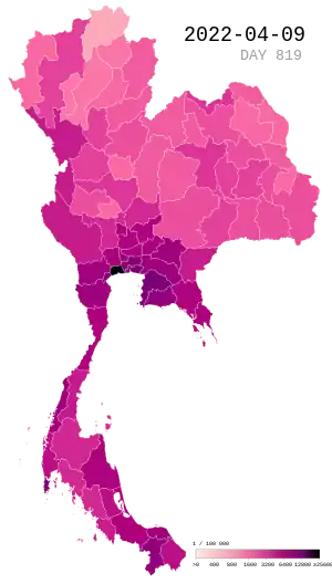 In mid-December, an outbreak occurred in Samut Sakhon, just southwest of Bangkok, increasing the country's total confirmed cases by at least 20%.[45] Cases in the province, which is the center of the country's fishing industry, primarily impacted migrant workers from Myanmar,[45] a major source of labour in the seafood industry.[46] Over 1,300 cases were traced to a seafood market in Samut Sakhon, as cases were detected in 27 provinces.[47] Before the surge, Thailand had recorded about 4,300 COVID-19 cases and just 60 deaths, while Myanmar had registered about 117,000 cases.[46] The 576 cases reported on 20 December was Thailand's biggest daily increase and caused the nation's overall total to climb 13%.[48] A new cluster emerged in Rayong, linked to a gambling den. On 28 December, a worker at the den died, Thailand's first COVID-19 death in nearly two months.[49][50] With the clusters starting to spread into Bangkok, the Bangkok Metropolitan Administration announced that the city would close schools and daycare centres 4–17 January 2021.[51] Soon after, the Ministry of Education ordered all schools closed for the month of January.[52]