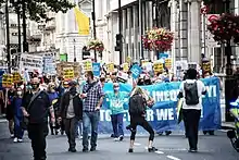 Protests took place across the UK on 3 July 2021 to mark the 73rd anniversary of the NHS. NHS staff and activists demanded greater funding, wage increases and staffing, better working conditions and to end proposed privatisation of the service.[65]