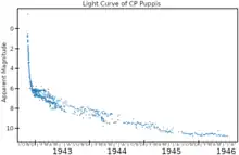 CP Puppis (or Nova Puppis 1942) was a bright nova occurring in the constellation Puppis in 1942. The nova was discovered on 9 November 1942 by Bernhard Dawson at La Plata, Argentina, when it had an apparent visual magnitude of about 2.[6][7] It was independently discovered at 18:00 10 November 1942 (UT) by a 19-year-old Japanese schoolgirl, Kuniko Sofue, who looked at the sky after patching her socks and noticed the nova.[5] For this discovery, asteroid 7189 Kuniko was named in her honor.[8]