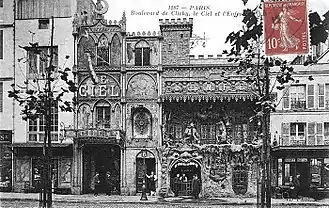 Jules Claretie, who wrote that future historians of the mores of the Belle Epoque "could not silently pass by these cabarets",[1] described them as "putting Dante's poem within walking distance".[2] For Georges Renault and Henri Château, "Le Ciel and L'Enfer, gaping wide-open all in a row" was worthy of the label "spectacular".[3] The flâneurs of Paris entered through the monumental jaws of Leviathan, devourer of the damned. The intimidating façade was "a stucco ode to female nudity being devoured by infernal flames".[4]