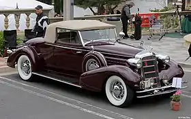 The 1932 Series 355B was even longer and lower, with an entirely restyled front assembly. The roof line was lowered 1–3 in (25–76 mm). The longer hood had six hood ports. The new front end styling included a flat grille built into the radiator shell, head and side lights of streamlined bullet shape and the elimination of the fender tie bar and monogram bar. The trumpets of the dual horns projected through the headlight stanchions. The headlight lenses were 9.5 in (241 mm) in diameter. The dual taillights matched the headlights. Headlights featured three filament bulbs and four contour positions for degree and angle of illumination. The front license plate was mounted on the bumper. Runningboards curved to match the sweep of the front fenders and blended into the rear fenders. The tail of the rear fenders blended into the fuel tank valence. The trunk on the town sedan, town coupe and five-passenger convertible coupe was integral with the body. The vision of the driver was improved by 30 percent as a result of the elimination of the outside visor and the construction of a 12 degree sloping windshield and corner posts. There was a large ventilator on top of the cowl and none on the sides. All separate body moldings were eliminated. A three spoke steering wheel enabled an unobstructed view of the instrument cluster when in the straight ahead position. The right side of the instrument panel was occupied by a "locker." Engine horsepower increased to 115. The deepening Great Depression caused sales plummet to 2,700.[1][2]