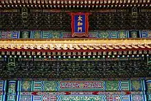 Caihua (Chinese: 彩画; pinyin: cǎihuà), or "colour painting", is the traditional Chinese decorative painting or polychrome used for architecture and one of the most notable and important features of historical Chinese architecture. It held a significant artistic and practical role within the development of East-Asian architecture, as Caihua served not only decoration but also protection of the predominantly wooden architecture from various seasonal elements and hid the imperfections of the wood itself. The use of different colours or paintings would be according to the particular building functions and local regional customs, as well as historical periods. The choice of colours and symbology are based on traditional Chinese philosophies of the Five Elements and other ritualistic principles. [1][2] The Caihua is often separated into three layer structures; timber or lacquer layer, plaster layer, and pigment layer.