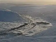 The Cairngorms themselves are a spectacular landscape, similar in appearance to the Hardangervidda National Park of Norway in having a large area of upland plateau. The range consists of three main plateaux at about 1000–1200 m above sea level, above which domed summits (the eroded stumps of once much higher mountains)[8] rise to around 1300 m. Many of the summits have tors, free-standing rock outcrops that stand on top of the boulder-strewn landscape.[9] The edges of the plateaux are in places steep cliffs of granite and they are excellent for skiing, rock climbing and ice climbing. The Cairngorms form an arctic-alpine mountain environment, with tundra-like characteristics and long-lasting snow patches.[9]
