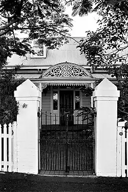 The corrugated iron roof features two dormer windows with semi-circular tank roofs, as well as a window in each gable. The verandah across the front and down the right side of the house has timber posts with cast-iron balusters, brackets and valances. The entrance is marked by a fretwork pediment, beyond which is the panelled front door with leadlight fan and sidelights.[1]