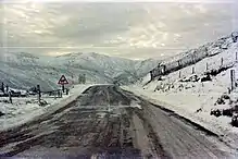The Cairnwell Pass (Scottish Gaelic: Càrn a' Bhailg) is a mountain pass on the A93 road between Glen Shee, Perthshire, and Braemar, Aberdeenshire, in the Scottish Highlands. The border between the two counties crosses the summit of the pass. With a summit altitude of 670 m (2,200 ft), the Cairnwell Pass is the highest main road in the United Kingdom, and at the summit is the Glenshee Ski Centre, Scotland's largest and oldest ski centre.[1] Historically, the pass was a drover's route from the Lowlands to the Highlands. The road is often blocked by snow in the winter, with snow gates at Braemar, at the summit (south of the Ski Centre), and at the Spittal of Glenshee.