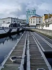The oldest view of the old wharf was characterized in an engraving of the port around 1590, showing the anchorage alongside Monte Brasil. At that time, the ravine that flowed into the bay allowed naval repair, with its access along Rua de São João. Along Rua Direita a fortified passage existed that canalized the ravine's water to the port, where they supported naval ships.