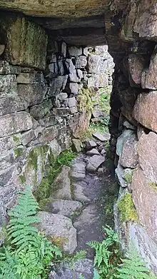 The interior of the broch has two intramural rooms at ground level, one of which is a small, oval cell.[2] The other is a long mural cell, or length of ground gallery, which has a blocked doorway.[2] The sides of an upper room are apparent above the entrance passage.[2] Also inside the broch is a doorway to the mural stair. The five steps of the stair lead up to a long landing which leads to the beginning of a second flight of stairs.[2]