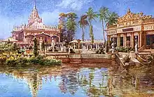 [7] The walls of the temple features mosaics and other ornamental work. The main shrine is divded into three section.,The inner-most section enshrines idols of Tirthankaras. The marble images wear gold necklace, silver lotus pedestals, and a big diamond-inlaid forehead.[8] The outer section is richly decorated with ornate mosaic glasswork on the walls, ceiling, and columns. This section also features a chandelier with over a hundred branches.[3] Outside the temple is a garden with Indian and exotic plants. The garden is full of sculptures and fountains in the middle. It is considered a testimony of architecture and artistry.[9][4]