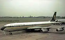 Caledonian planned to place an order directly with Boeing for two convertible 707-320Cs that could either be operated in an all-passenger or all-cargo configuration and featured a large freight door on the left-hand side of the forward fuselage to enable carriage of main deck cargo when configured as a freighter. The initial order needed to be placed before the end of 1965 to secure the first aircraft's delivery in May 1967, just in time for that year's summer season.[55][87][88][89] To avoid paying the 14% tax the UK Government had imposed on imported, new foreign aircraft to protect competing British models,[90][91] Caledonian needed to persuade the BOT that there was no equivalent home-grown alternative. It also cited the BOT's earlier decision to approve BOAC's application for an import duty waiver on two new Boeing 707-336Cs as a precedent.[90] However, the BOT was unwilling to grant Caledonian the requested tax exemption[89][92] and was instead assisting Vickers in selling it the Super VC10, the stretched version of the original "standard" VC10 and Britain's answer to the all-American 707 and DC-8. Despite the BOT's and Vickers's best efforts, Caledonian's senior management remained unconvinced that the Super VC10 was a worthy competitor of the 707. The results of its evaluation had shown that the Super VC10 was not competitive with the 707, in terms of amortisation, resale value and availability of finance due to its small production run. Apart from its insufficient range to fly non-stop from the UK to the US West Coast with a viable payload, significantly smaller cargo capacity and lack of passenger/freighter convertibility, the Super VC10 was also heavier than the 707. This increased fuel consumption.[89][93][94] In its ongoing negotiations with the BOT, Caledonian cited these findings as evidence that there was no suitable British alternative to the 707 for the envisaged role. The BOT however continued to insist that irrespective of Caledonian's specific requirements, the 707 and Super VC10 were equivalent and, based on this assessment, refused the airline's application for an import duty waiver.[92] Meanwhile, the civil engine production hold-up caused by the Vietnam War resulted in the first aircraft arriving in July rather than May 1967. This did not allow its utilisation for that year's full summer charter season precluding a profitable operation. These circumstances compelled Caledonian to lease out its first 707 to the Flying Tiger Line until May 1968. To facilitate the 707's smooth introduction into service the following summer, Caledonian required access at its Gatwick base to its second aircraft (ordered in 1966) for as much as winter 1967–68 as possible to complete aircrew and ground support training in time for the following summer season. This was not possible as long as the standoff between the airline and the BOT continued. To avoid having an expensive, new jet aircraft sit idly on the ground in the absence of a timely resolution, the airline's senior management put in place a contingency plan to transfer the 707 training programme to Shannon Airport as the BOT had no jurisdiction over the Republic of Ireland. In the event, the contingency plan was not activated as a compromise was reached in early December 1967 that resulted in the BOT granting Caledonian's request for an import duty exemption. This permitted the airline to import the aircraft into the UK free of duty, as long as non-stop sectors outside the Super VC10's economically viable range accounted for a significant share of its operations. It enabled Caledonian to take delivery of its second 707, a 399C series aircraft bearing the registration G-AVTW ("Tango Whisky"), at Gatwick on 30 December 1967. The first aircraft – Boeing 707-399C G-AVKA ("Kilo Alpha") – joined the second at Gatwick on 1 June 1968, following the end of the Flying Tigers lease. Both began operating a series of charters, carrying 15,000 passengers from Los Angeles and Oakland to the UK.[23][28][95][96][97][98][99]