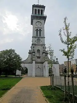The tower stands 46 m (151 ft) designed to act as a focal point for drovers entering London.[5] It has five storeys and is constructed of Portland stone.[11] The base is rusticated and is supported by "swooping buttresses" on each side.[4] The clock set into the fourth storey is by the firm of John Morris of Clerkenwell[11] and has a set of three bells which rang each day to signal the market's opening and closing. The final storey has a balustrade giving good views over London,[12] and is topped with a weather vane in the form of a dragon which was re-gilded during the restoration in 2016-2019.[lower-alpha 2][13] Bridget Cherry, in her revised London 4: North edition of the Pevsner Buildings of England, describes the Caledonian Park Clock Tower as "magnificent; Italianate with Baroque buttreses and a more conventional Quattrocento top".[4] The tower is a Grade II* listed building.[11] Two sets of railings which once fully enclosed the market are listed Grade II.[14][15] Only three of the four public houses which originally stood at each corner of the market site remain, The White Horse,[16] The Lamb,[17] and The Lion, each of which is also listed Grade II.[18] The fourth, The Black Bull, which stood at the south-west corner has been demolished.[4]