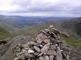 The summit is a rocky knoll with a small crag directly to the south. There is a tidy cairn although the patch of rushes noted by Wainwright[2] is no longer in evidence.[3] A tarn lies between here and a subsidiary top to the west.