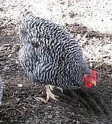 The California Gray was developed in California in the 1930s by Horace Dryden in Modesto, California.[4]: 432 His aim was to produce a dual-purpose chicken that would be suitable for meat production and would also lay large white eggs. By cross-breeding of Barred Plymouth Rock and White Leghorn birds, an autosexing breed with barred gray adult plumage was produced. As in other autosexing breeds, the sex of chicks can be distinguished at about a day old.[2]: 47