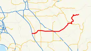 Except where prefixed with a letter, postmiles were measured on the road as it was in 1964, based on the alignment that existed at the time, and do not necessarily reflect current mileage. R reflects a realignment in the route since then, M indicates a second realignment, L refers to an overlap due to a correction or change, and T indicates postmiles classified as temporary (for a full list of prefixes, see California postmile § Official postmile definitions).[1] Segments that remain unconstructed or have been relinquished to local control may be omitted. The numbers reset at county lines; the start and end postmiles in each county are given in the county column.