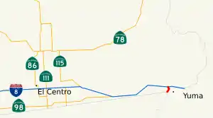 SR 186 is part of the National Highway System,[5] a network of highways that are considered essential to the country's economy, defense, and mobility by the Federal Highway Administration.[6] In 2014, SR 186 had an annual average daily traffic (AADT) of 3,800 vehicles at the southern end, and 8,200 vehicles at the junction with I-8, the latter of which was the highest AADT for the highway.[7]