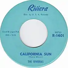 The most successful version of the song was released by the Rivieras in 1963 and became the group's biggest hit in their short career. This song was the result of their first recording session at Chicago's Columbia Recording Studios in 1963 (purchased by manager Bill Dobslaw). The lineup for this session included Marty Fortson on vocals and rhythm guitar, Joe Pennell on lead guitar, Doug Gean on bass guitar, Otto Nuss on Vox Continental organ, and Paul Dennert on drums. The original single cut from this session included the song "Played On" as the A-side, with "California Sun" as the B-side and was released on Dobslaw's Riviera label in 1963. DJ Art Roberts ensured that the "California Sun" side saw significant airplay on WLS. In response to the growing success, Dobslaw got the band a national distribution deal with USA Records, and the song was adequately distributed with "H.B. Goose Step" as the B-side.