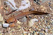 The Pacific giant salamander (D. ensatus) was thought to consist of three geographic populations: an Idaho group, a group in northern California, and a group in Oregon and Washington.[2] In 1989 genetic studies showed that the D. ensatus populations consisted of three species: the Idaho giant salamander (Dicamptodon aterrimus) in Idaho, and two highly divergent species with a narrow hybrid zone in California, the coastal giant salamander (Dicamptodon tenebrosus) (ranging from northern California to Washington) and the California giant salamander (Dicamptodon ensatus) (ranging from Santa Cruz County to Mendocino County).[3][4] A fourth species of Dicamptodon, Cope's giant salamander (D. copei), lives on the Olympic Peninsula, Washington.