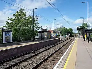 The station has two platforms, both of which have ticket machines (which accept cash, card and contactless payment),[4] smartcard validators,[5] sheltered waiting area, seating, next train audio and visual displays, timetable and information posters and an emergency help point. There is step-free access to both platforms. The station serves as a park and ride, with 189 spaces (plus seven accessible spaces). There is also cycle storage at the station, with four cycle lockers and five cycle pods.[6]