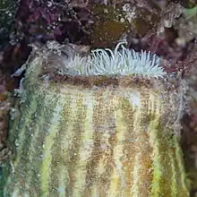 Calliactis parasitica is a species of sea anemone associated with hermit crabs. It lives in the eastern Atlantic Ocean and Mediterranean Sea at depths between the intertidal zone and 60 m (200 ft). It is up to 10 cm × 8 cm (3.9 in × 3.1 in) in size, with up to 700 tentacles, and is very variable in colour. The relationship between C. parasitica and the hermit crab is mutualistic: the sea anemone protects the hermit crab with its stings, and benefits from the food thrown up by the hermit crab's movements.