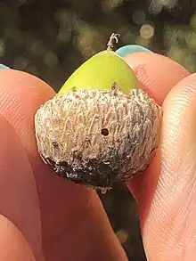 Callirhytis eldoradensis, formerly Andricus eldoradensis, the acorn gall wasp, is a species of hymenopteran that induces galls on the acorns of coast live oaks, interior live oaks, and canyon live oaks in California in North America.[1][2] This gall is not as readily visible as some of the showier oak galls, but exit holes may be visible on the acorns, and galled acorns are likely to stay on the tree after other acorns have dropped.[2] The unisexual generation of this wasp produces a modest bud gall.[2]