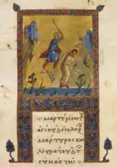 The earliest artistic depiction of Callistratus or his companions is in the Menologion produced for the Emperor Basil II around 1000. Despite his being a warrior saint, he is not depicted as a soldier. He is depicted beheaded. This seems to have set the standard for later depictions. The Metaphrastic biography is illustrated in British Library Add MS 11870 and Biblioteca Marciana gr. Z. 586 with a miniature of his execution. In Bodleian Library MS Barocci 86 he is one of the saints depicted in the frontispiece. He is shown as a prince. Similar iconography appears in later menologia. Callistratus and/or his companions are depicted in the Church of the Metamorphosis, the monasteries of Meteora and Cozia and in bust form in the church of Pelinovo.[2]