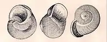 | Original drawing with three views of a shell of Callomphala globosa | |