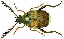 This species exhibits some sexual dimorphism where the female is larger and heavier than the male beetle. The antennae are pectinate in males while in females, the antennae are serrate.[5]
