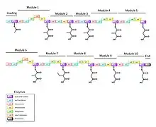 Although the biosynthetic pathway of callystatin A has not been explicitly described, its polyketide structure indicates that the pathway must involve the polyketide synthase (PKS) enzyme complex. In general, in a modular fashion, an acetate starting unit in the loading module is extended by two carbons each time by the ketosynthase (KS) domain. The acyl groups are loaded onto the acyl carrier protein (ACP) with the help of the acyltransferase (AT) domain. Each module contains different combinations of the ketoreductase (KR), dehydratase (DH), and enoyl reductase (ER) domains that can modify and tailor the two-carbon subunits to form the resulting fatty acid chain. The final module contains a thioesterase (TE) domain that hydrolyzes the thioester bond to release the fatty acid chain and coenzyme A.