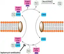 - 1 2 3 Stade, K.; Ford, C. S.; Guthrie, C.; Weis, K. (1997). "Exportin 1 (Crm1p) is an essential nuclear export factor". Cell. 90 (6): 1041–1050. doi:10.1016/S0092-8674(00)80370-0. PMID 9323132.