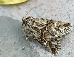 C. lunula Hufn. (= linariae Esp.) (29 b). Forewing bluish grey, suffused with olive fuscous, especially in median area and along an oblique fascia from apex to before anal angle; lines double, filled in with grey, but only distinct below middle, curved and approximating; claviform stigma elongate, bluish grey edged with black; orbicular small, flattened, white edged with black ; reniform conspicuous, white with black lateral edges; some black streaks in the intervals across the oblique apical fascia; fringe chequered, olive brown and grey;hindwing dingy grey with the veins and braces of outer line darker; a smoky blackish broad terminal border. Larva bluish grey, with all the lines yellow; a dorsal series of transverse oblong velvety black blotches, and lateral series of black spots.[1] 12 millimeters long.