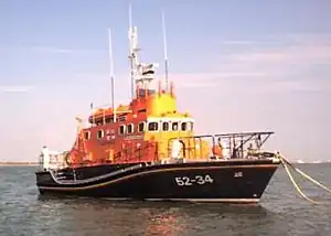The second lifeboat at the station was the Brede-class lifeboat RNLB Safeway (ON 1104), which was moored just off Calshot Castle.[9][10] The crew used a davit-launched boarding boat when called out on service. Safeway, which was funded by and named for the Safeway supermarket chain, was built by Lochin Marine at Newhaven, East Sussex in 1985.[11] Like the Ernest William she had a fibreglass hull but was self-righting due to her watertight cabin.