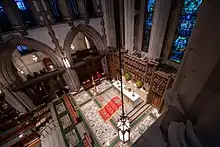 The 1991-1993 restoration included plaster repairs, cleaning of stone, and addition of handicapped access ramps. The pendant lights were moved to the center of the bays to provide more uniform light, and a new wood floor was installed to replace the former wood floor under the pews to improve the acoustic performance of the space. A crossing platform was added to extend the level of the chancel towards the nave and to provide a place for a temporary altar closer to the congregation for medium-sized services (the transept pews were turned to face the new platform at this time); the new platform also provided safer passage to the lectern. New floor tile for the platform was carefully made by hand in North Carolina so as to match the original and allow for repairs to the original floor where needed. The crossing chandelier, having been taken down and deconstructed (the large ring had been used in the Narthex), was restored and reconstructed from pieces found in the basement. The All Saints' Chapel altar rail, installed in 1924, was removed and relocated to the baptistery (the chapel had been renamed "All Saints' Chapel" from "St. Andrew's Chapel" around 1940). The new parclose screen in the All Saints' Chapel was made by Herbert Read Ltd. of Tiverton, Devon, England. In the Lady Chapel, two reconstructions of the original electric lamps designed by Cram's partner Bertram Goodhue were hung in the space. A wood screen was added to define the space of the All Saints' Chapel, and an original lighting fixture was installed.[4]