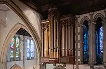 The second and current organ in Calvary Church is by Casavant Frères Limitée, Opus 2729, 1963. The case of the Casavant organ was carved by Andrew Druscelli of Irving and Casson A.H. Davenport Company of Cambridge, Massachusetts. As part of the 1991-1993 restorations, a new organ console was constructed to accommodate the enlargement and enhancement of the instrument. It was moved from being closer to the altar to its present location behind the lectern, facing the center of the chancel to allow the organist to face the choir.[4]
